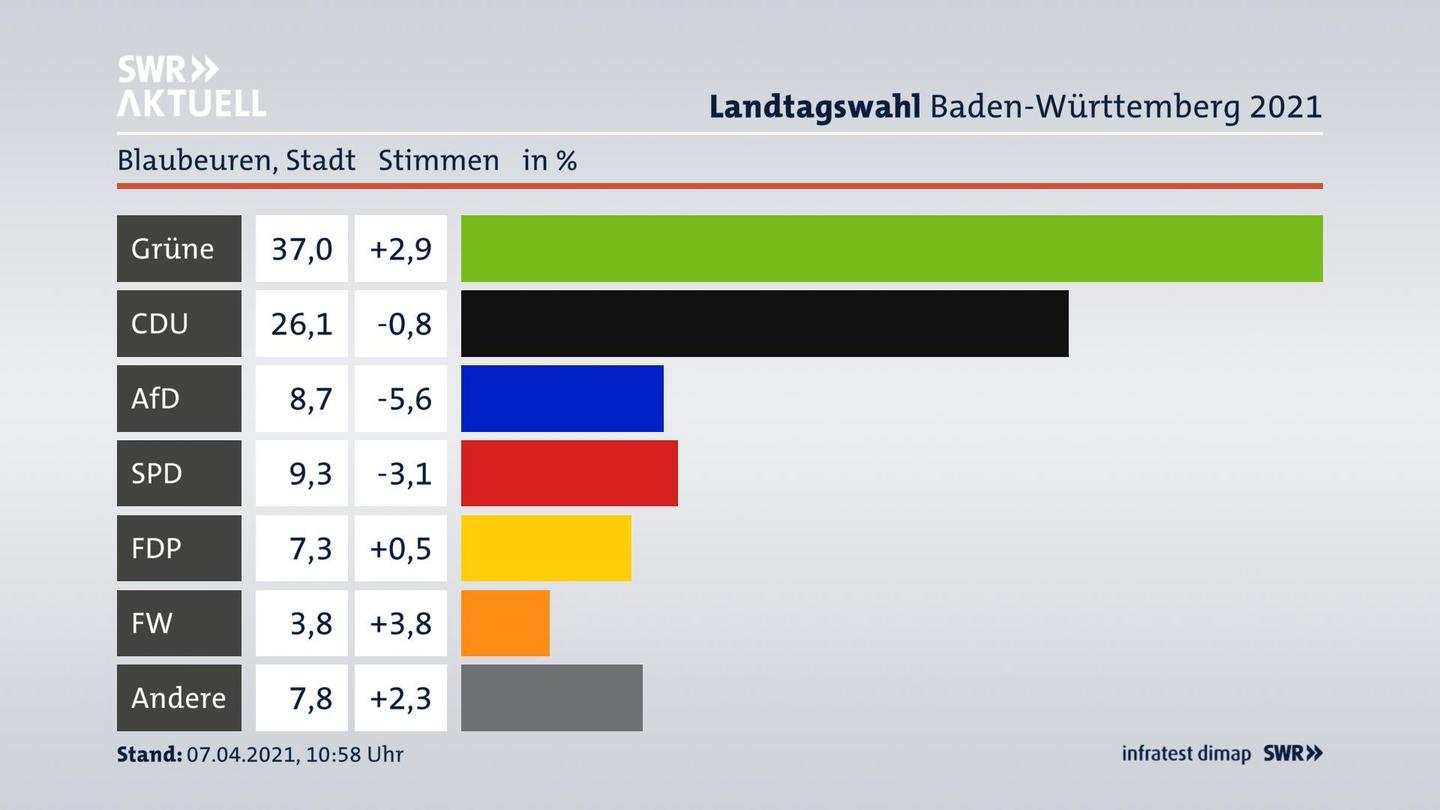 In Blaubeuren, Stadt gewinnen die Grünen leicht (+2,9 Prozentpunkte) und erzielen 37,0 Prozent der gültigen Stimmen. Die CDU erreicht 26,1 Prozent und verliert leicht (-0,8 Prozentpunkte). Die AfD erzielt 8,7 Prozent und verliert stark (-5,6 Prozentpunkte). Die SPD verliert deutlich (-3,1 Prozentpunkte) und kommt auf 9,3 Prozent. Die FDP erreicht 7,3 Prozent und gewinnt leicht (+0,5 Prozentpunkte). Die Freien Wähler erzielen 3,8 Prozent und gewinnen deutlich (+3,8 Prozentpunkte). Die Wahlbeteiligung liegt bei 66,1 Prozent.