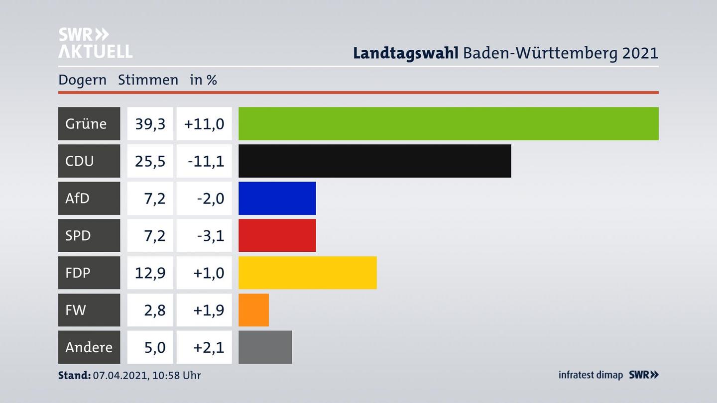 In Dogern gewinnen die Grünen stark (+11,0 Prozentpunkte) und erzielen 39,3 Prozent der gültigen Stimmen. Die CDU erreicht 25,5 Prozent und verliert stark (-11,1 Prozentpunkte). Die AfD erzielt 7,2 Prozent und verliert leicht (-2,0 Prozentpunkte). Die SPD verliert deutlich (-3,1 Prozentpunkte) und kommt auf 7,2 Prozent. Die FDP erreicht 12,9 Prozent und gewinnt leicht (+1,0 Prozentpunkte). Die Freien Wähler erzielen 2,8 Prozent und gewinnen leicht (+1,9 Prozentpunkte). Die Wahlbeteiligung liegt bei 64,7 Prozent.