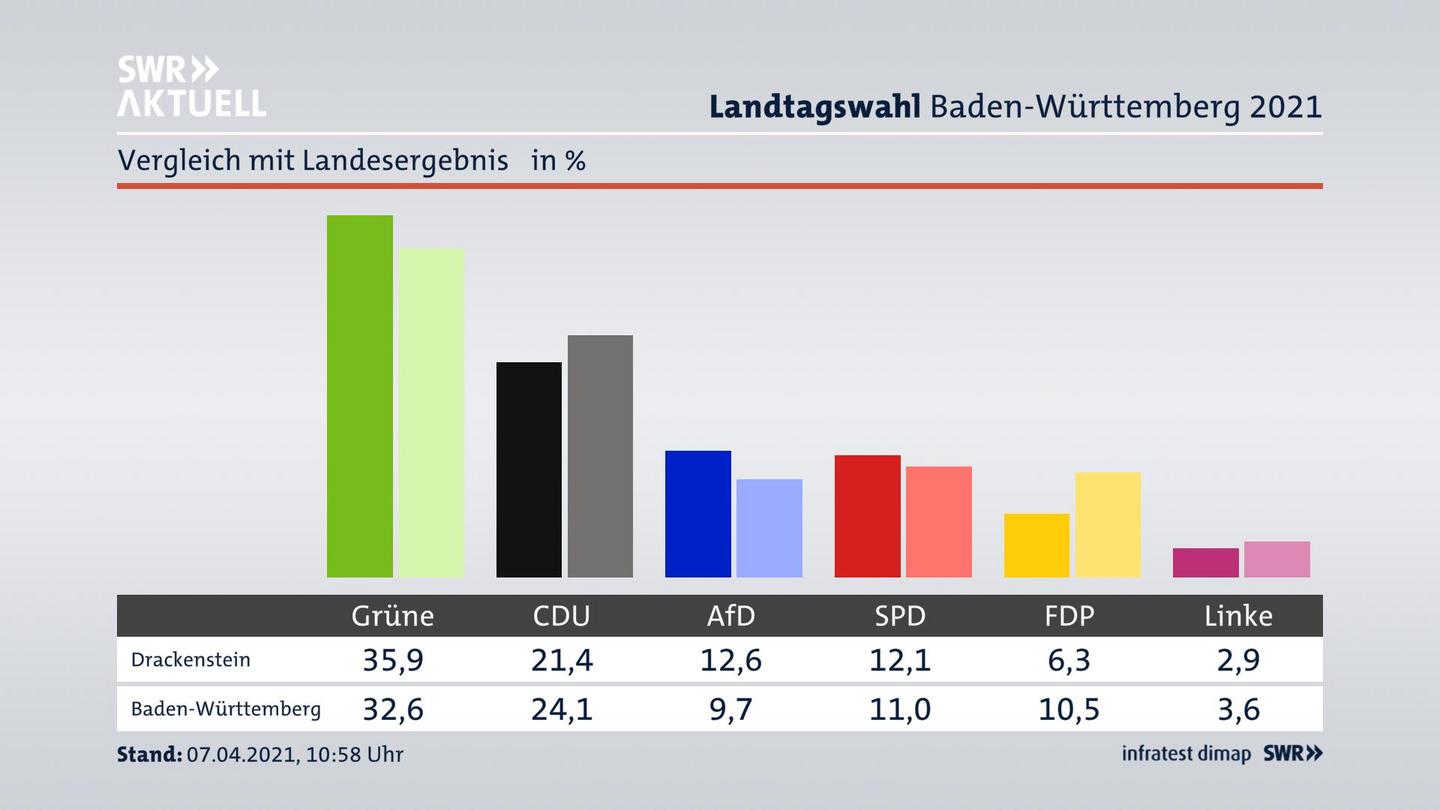In Drackenstein gewinnen die Grünen stark (+10,2 Prozentpunkte) und erzielen 35,9 Prozent der gültigen Stimmen. Die CDU erreicht 21,4 Prozent und verliert stark (-10,3 Prozentpunkte). Die AfD erzielt 12,6 Prozent und verliert stark (-6,7 Prozentpunkte). Die SPD gewinnt leicht (+2,2 Prozentpunkte) und kommt auf 12,1 Prozent. Die FDP erreicht 6,3 Prozent und verliert leicht (-1,1 Prozentpunkte). Die Freien Wähler erzielen 5,3 Prozent und gewinnen stark (+5,3 Prozentpunkte). Die Wahlbeteiligung liegt bei 63,6 Prozent.