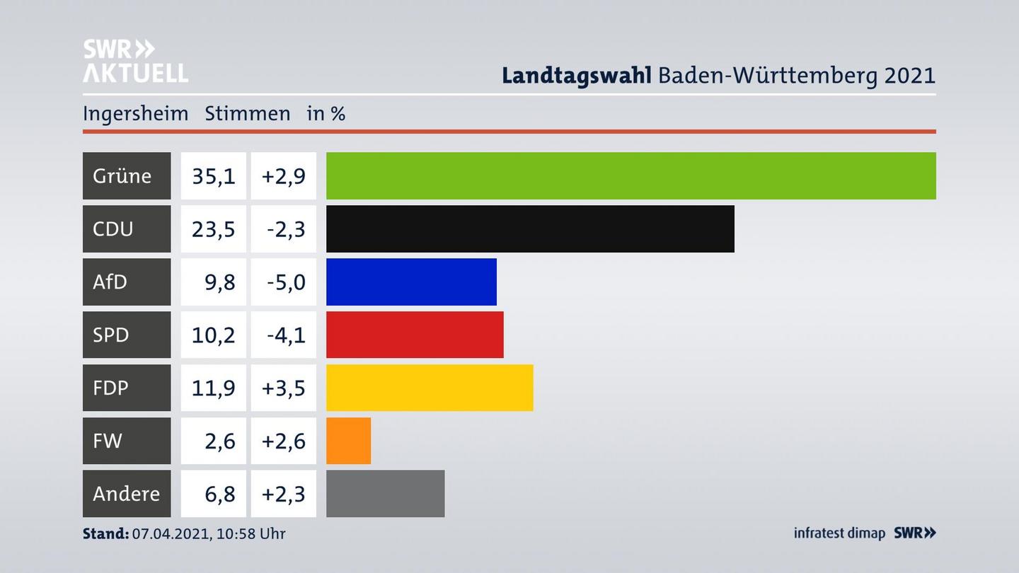 In Ingersheim gewinnen die Grünen leicht (+2,9 Prozentpunkte) und erzielen 35,1 Prozent der gültigen Stimmen. Die CDU erreicht 23,5 Prozent und verliert leicht (-2,3 Prozentpunkte). Die AfD erzielt 9,8 Prozent und verliert stark (-5,0 Prozentpunkte). Die SPD verliert deutlich (-4,1 Prozentpunkte) und kommt auf 10,2 Prozent. Die FDP erreicht 11,9 Prozent und gewinnt deutlich (+3,5 Prozentpunkte). Die Freien Wähler erzielen 2,6 Prozent und gewinnen leicht (+2,6 Prozentpunkte). Die Wahlbeteiligung liegt bei 68,1 Prozent.