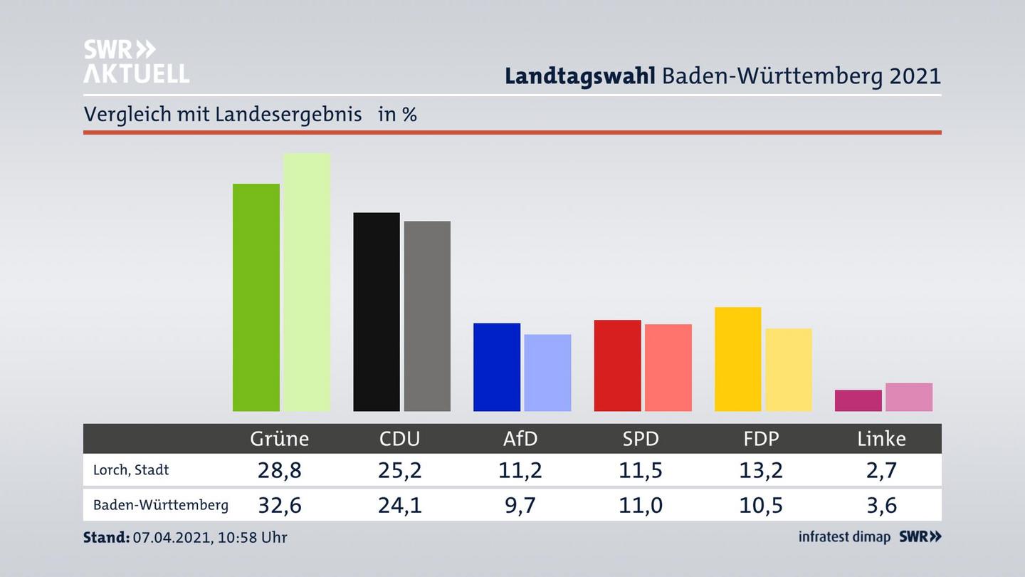 In Lorch, Stadt gewinnen die Grünen deutlich (+3,4 Prozentpunkte) und erzielen 28,8 Prozent der gültigen Stimmen. Die CDU erreicht 25,2 Prozent und verliert stark (-5,2 Prozentpunkte). Die AfD erzielt 11,2 Prozent und verliert deutlich (-4,9 Prozentpunkte). Die SPD verliert leicht (-1,6 Prozentpunkte) und kommt auf 11,5 Prozent. Die FDP erreicht 13,2 Prozent und gewinnt deutlich (+3,6 Prozentpunkte). Die Linke erzielt 2,7 Prozent und gewinnt leicht (+0,7 Prozentpunkte). Die Wahlbeteiligung liegt bei 67,2 Prozent.
