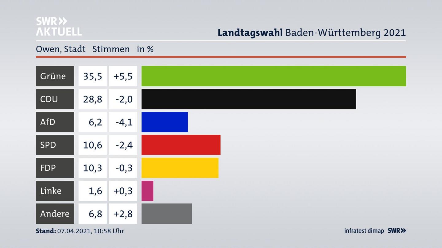 In Owen, Stadt gewinnen die Grünen stark (+5,5 Prozentpunkte) und erzielen 35,5 Prozent der gültigen Stimmen. Die CDU erreicht 28,8 Prozent und verliert leicht (-2,0 Prozentpunkte). Die AfD erzielt 6,2 Prozent und verliert deutlich (-4,1 Prozentpunkte). Die SPD verliert leicht (-2,4 Prozentpunkte) und kommt auf 10,6 Prozent. Die FDP erreicht 10,3 Prozent und verliert leicht (-0,3 Prozentpunkte). Die Linke erzielt 1,6 Prozent und gewinnt leicht (+0,3 Prozentpunkte). Die Wahlbeteiligung liegt bei 75,4 Prozent.