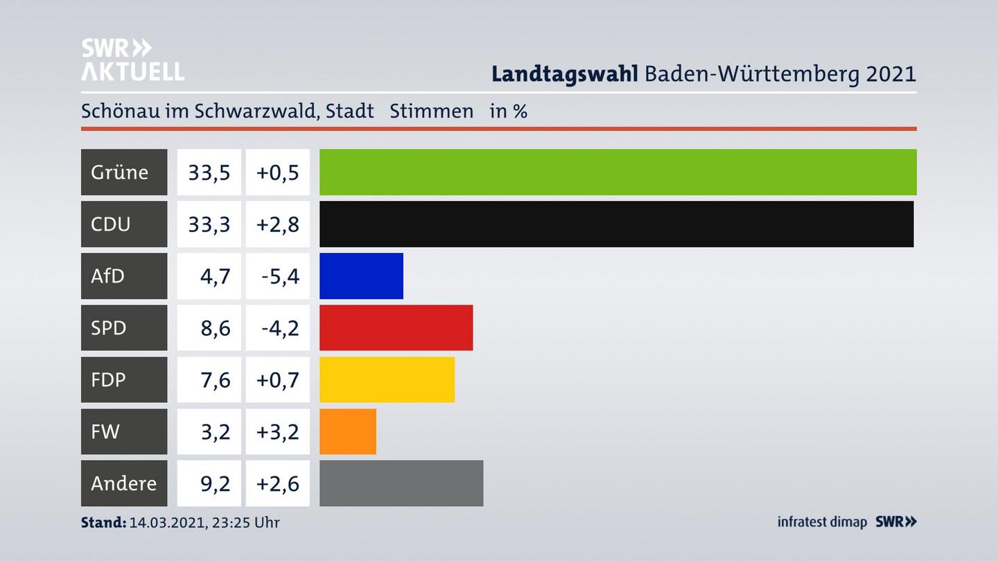 In Schönau im Schwarzwald, Stadt gewinnen die Grünen leicht (+0,5 Prozentpunkte) und erzielen 33,5 Prozent der gültigen Stimmen. Die CDU erreicht 33,3 Prozent und gewinnt leicht (+2,8 Prozentpunkte). Die AfD erzielt 4,7 Prozent und verliert stark (-5,4 Prozentpunkte). Die SPD verliert deutlich (-4,2 Prozentpunkte) und kommt auf 8,6 Prozent. Die FDP erreicht 7,6 Prozent und gewinnt leicht (+0,7 Prozentpunkte). Die Freien Wähler erzielen 3,2 Prozent und gewinnen deutlich (+3,2 Prozentpunkte). Die Wahlbeteiligung liegt bei 97,1 Prozent.