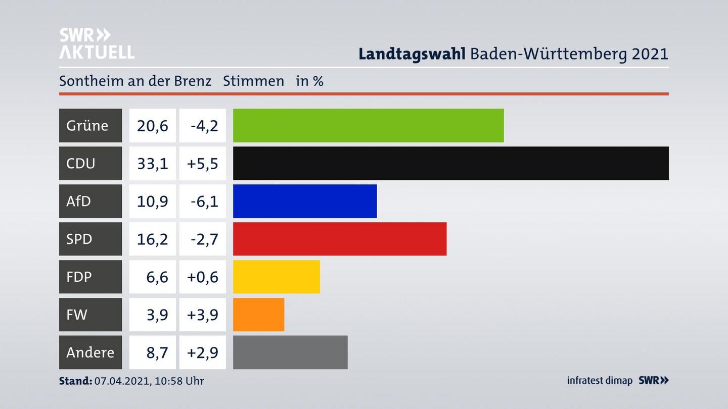 In Sontheim an der Brenz verlieren die Grünen deutlich (-4,2 Prozentpunkte) und erzielen 20,6 Prozent der gültigen Stimmen. Die CDU erreicht 33,1 Prozent und gewinnt stark (+5,5 Prozentpunkte). Die AfD erzielt 10,9 Prozent und verliert stark (-6,1 Prozentpunkte). Die SPD verliert leicht (-2,7 Prozentpunkte) und kommt auf 16,2 Prozent. Die FDP erreicht 6,6 Prozent und gewinnt leicht (+0,6 Prozentpunkte). Die Freien Wähler erzielen 3,9 Prozent und gewinnen deutlich (+3,9 Prozentpunkte). Die Wahlbeteiligung liegt bei 68,4 Prozent.